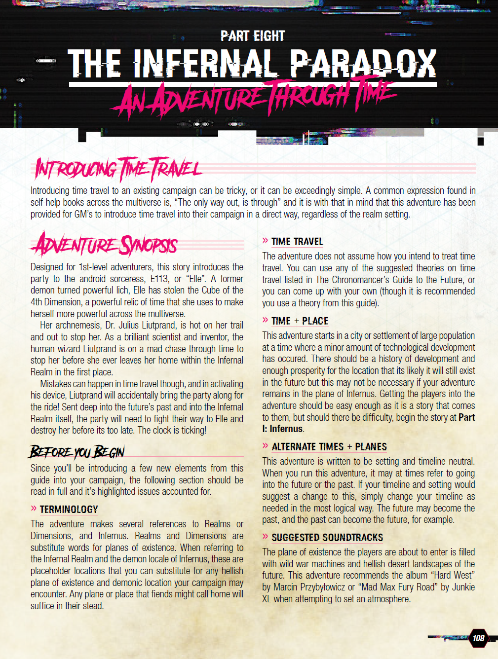 A complete DM's toolbox and player options for running time travel campaigns set in your own campaign setting. You'll gain access to the secrets of the new Reweaved Multiverse and the Spinning Wheel - a brand-new end-of-time setting.